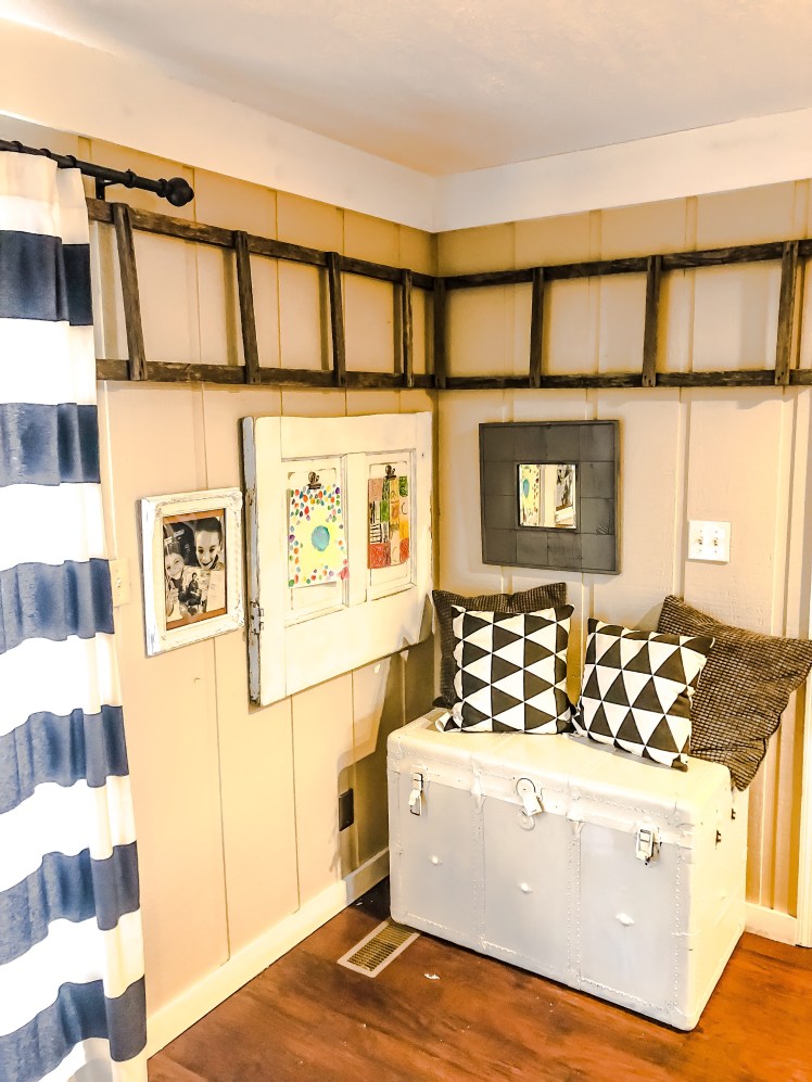 If you’re ever at a loss for inspiration…go to an AUCTION! Don’t be intimidated if you’ve never been to one, the auctioneers are very kind and you can stand around the “regulars” until you get the hang of it. I scored some crazy good treasures this past weekend. A 10 foot vintage ladder (that I cut in half to wrap around a corner), an old door and a steam trunk (that I painted and is perfect to hold extra blankets AND added some additional seating).
